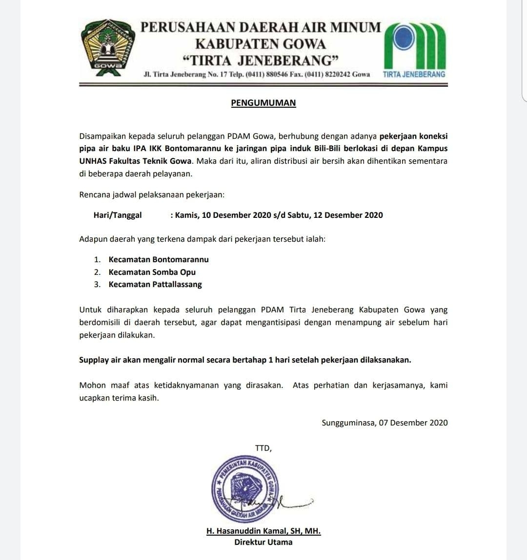 Sungguminasa. PDAM Tirta Jeneberang Kabupaten Gowa terus berupaya meningkatkan akses air minum terutama bagi Masyarakat Berpenghasilan Rendah (MBR) melalui Program Hibah Air Minum yang diadakan oleh Kementerian Pekerjaan Umum dan Perumahan Rakyat. Mekanisme program hibah ini, Pemda harus