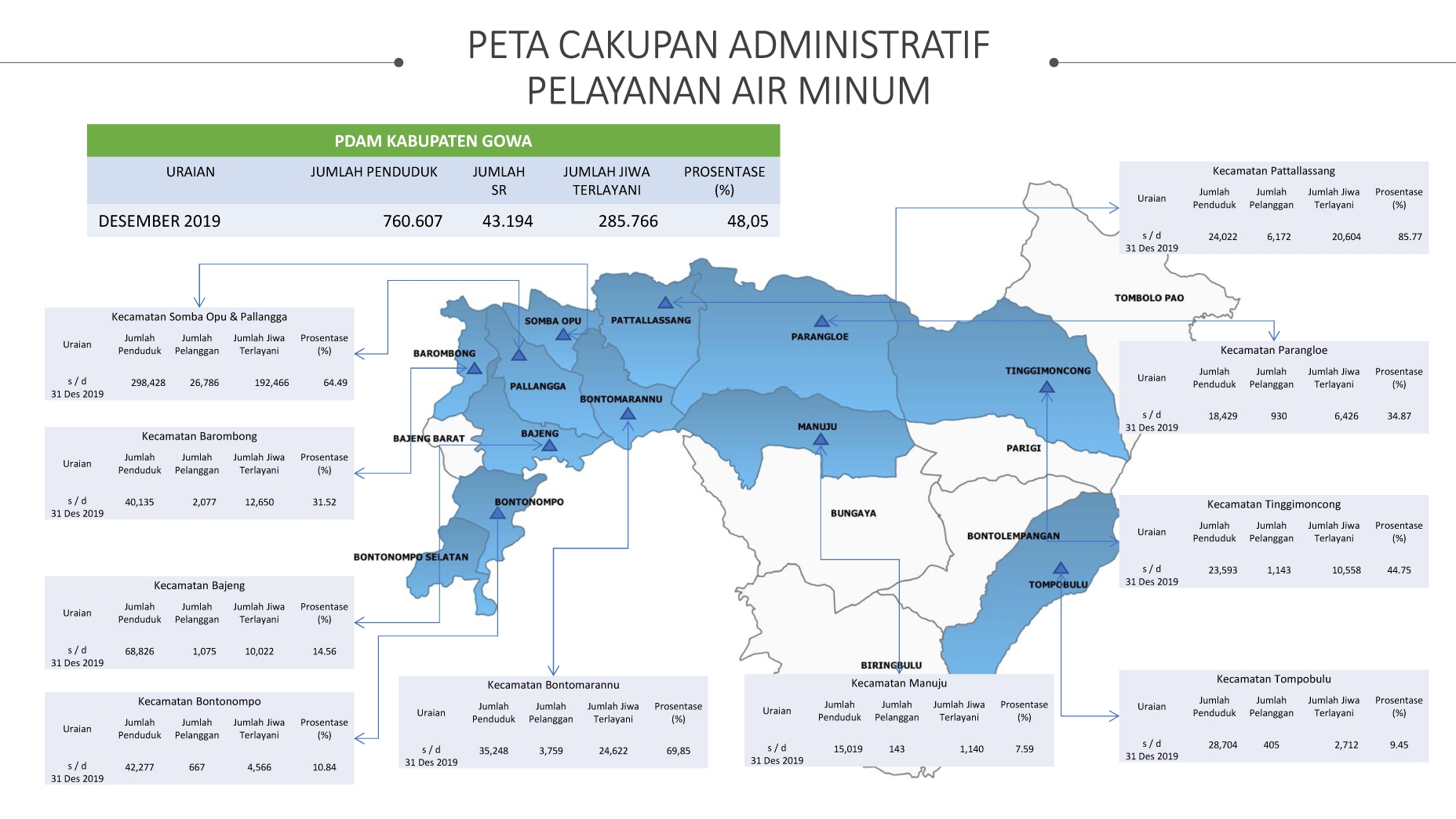 Jumlah penduduk yang mendapatkan pelayanan air minum sampai dengan bulan Desember tahun 2019 untuk wilayah teknis pelayanan sebesar 285.766 jiwa atau 48,05 % dari jumlah penduduk sebanyak 594.681 jiwa sedangkan untuk wilayah Kabupaten sebesar 37,57 % dari jumlah penduduk sebanyak 760.607 jiwaJumlah penduduk yang mendapatkan pelayanan air minum sampai dengan bulan Desember tahun 2019 untuk wilayah teknis pelayanan sebesar 285.766 jiwa atau 48,05 % dari jumlah penduduk sebanyak 594.681 jiwa sedangkan untuk wilayah Kabupaten sebesar 37,57 % dari jumlah penduduk sebanyak 760.607 jiwa